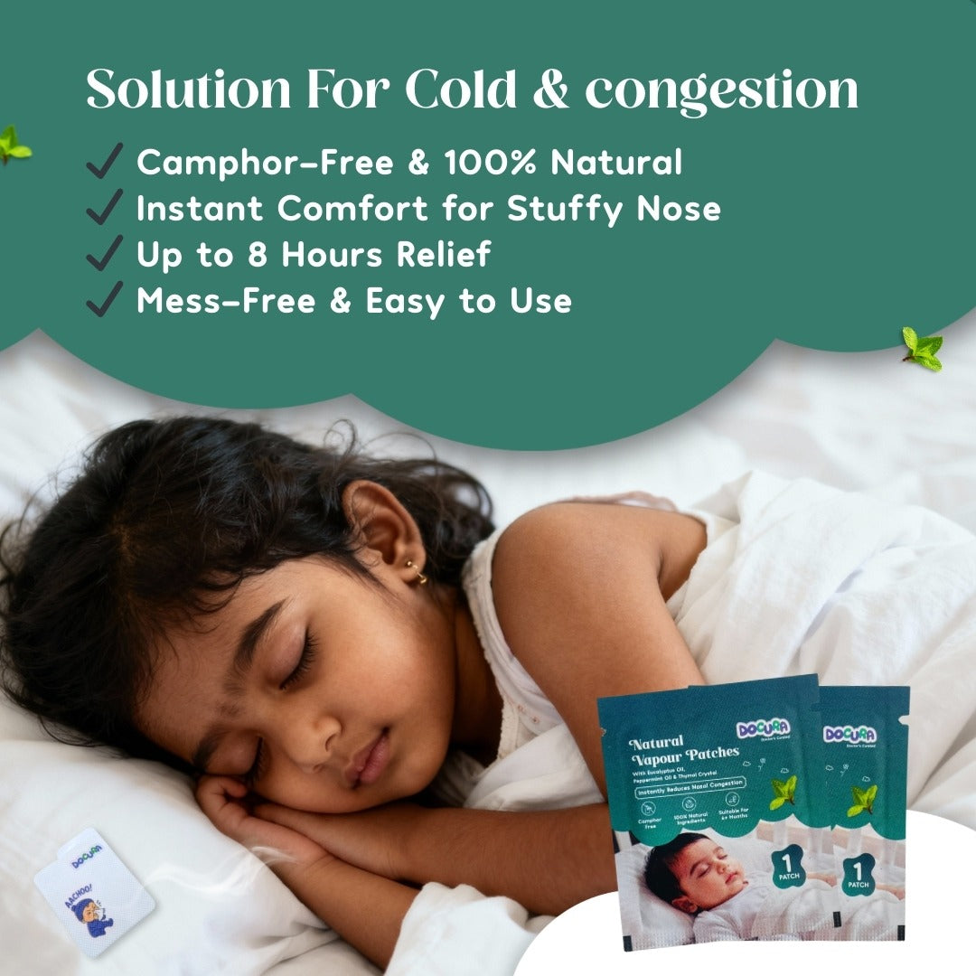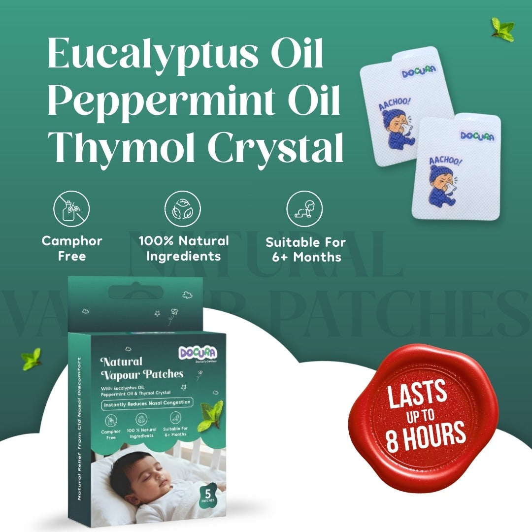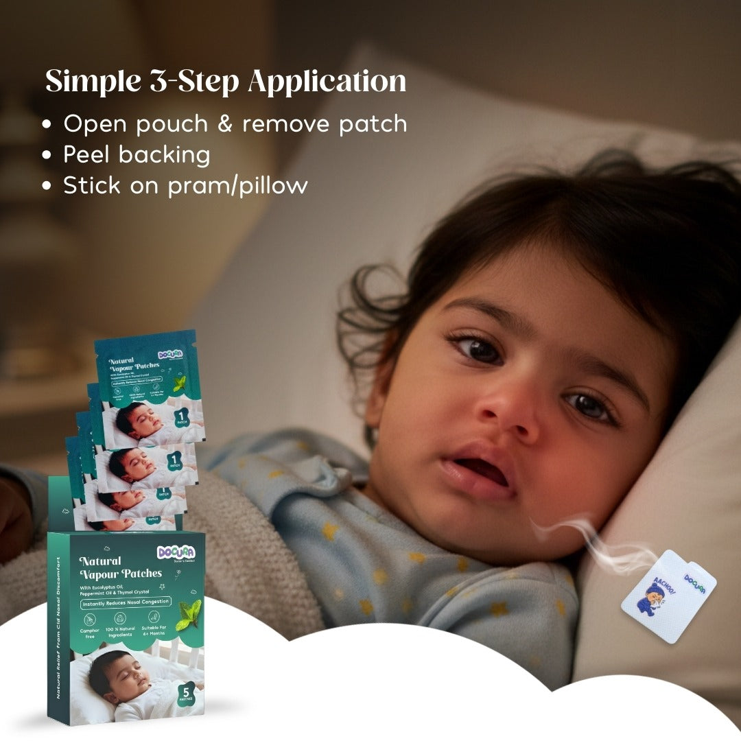 Docura Natural Vapour Patches are used to provide gentle vapour support to babies during nasal congestion caused by common cold, dry air, dust, or seasonal changes. They help babies breathe more comfortably, especially while sleeping at night..